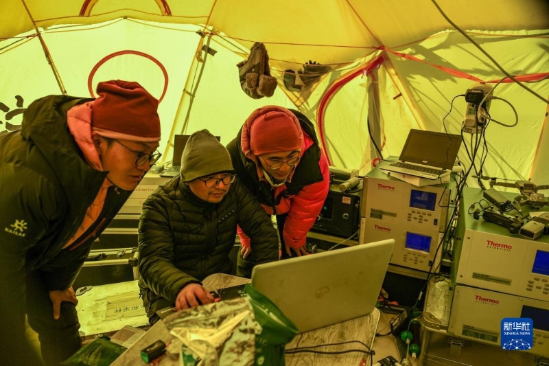 在珠峰登山大本營(yíng),科研人員查看大氣數(shù)據(jù)(5月3日攝)。
