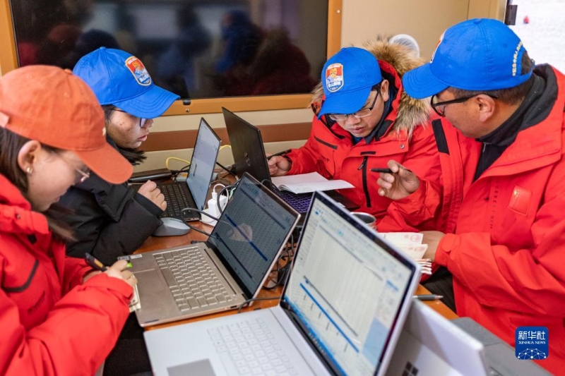 在珠峰登山大本營(yíng)的氣象應(yīng)急保障車內(nèi),西藏自治區(qū)氣象局工作人員在討論天氣實(shí)況(5月3日攝)。