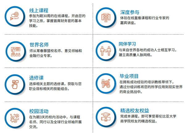 課程將通過在線和交互式的體驗進行學習,包括在線授課,選修課程,線下課程、畢業(yè)和校園活動等形式,以及常春藤盟校名師以及全球行業(yè)領(lǐng)袖的爐邊談話和嘉賓講座。課程經(jīng)過嚴謹設(shè)計,以滿足各行各業(yè),旨在為新?lián)问紫攧?wù)官或者即將擔任財務(wù)領(lǐng)導角色的個人提供課程深度內(nèi)容、專家?guī)熧Y團隊和價值難以估量的社交機會。