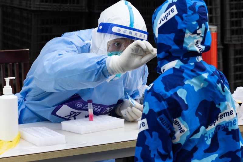 5月2日,在上海浦東北蔡鎮(zhèn)蓮中居民區(qū),來自杭州口腔醫(yī)院的援滬醫(yī)務(wù)人員在給居民做核酸采樣。(新華社記者金立旺 攝)