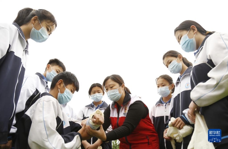 5月7日,河北省邢臺市襄都區(qū)紅十字會應(yīng)急救護(hù)講師在指導(dǎo)學(xué)生學(xué)習(xí)急救包扎。