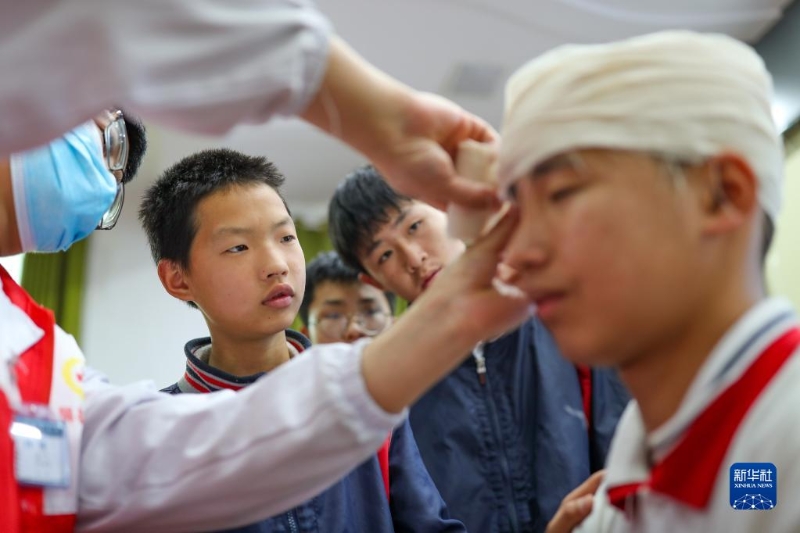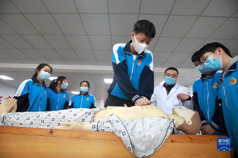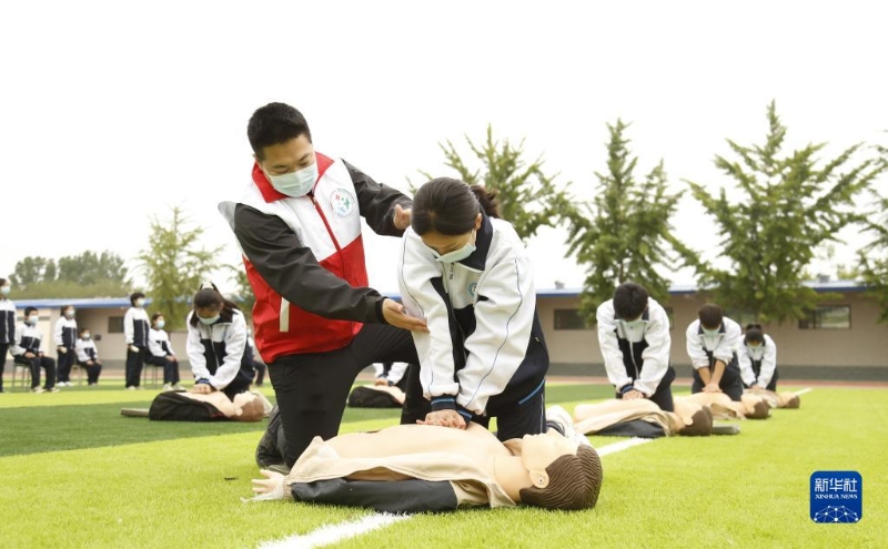 5月7日,在河北省石家莊市藁城區(qū)廉州第一中學(xué),學(xué)生在醫(yī)務(wù)人員指導(dǎo)下模擬進(jìn)行心肺復(fù)蘇急救。