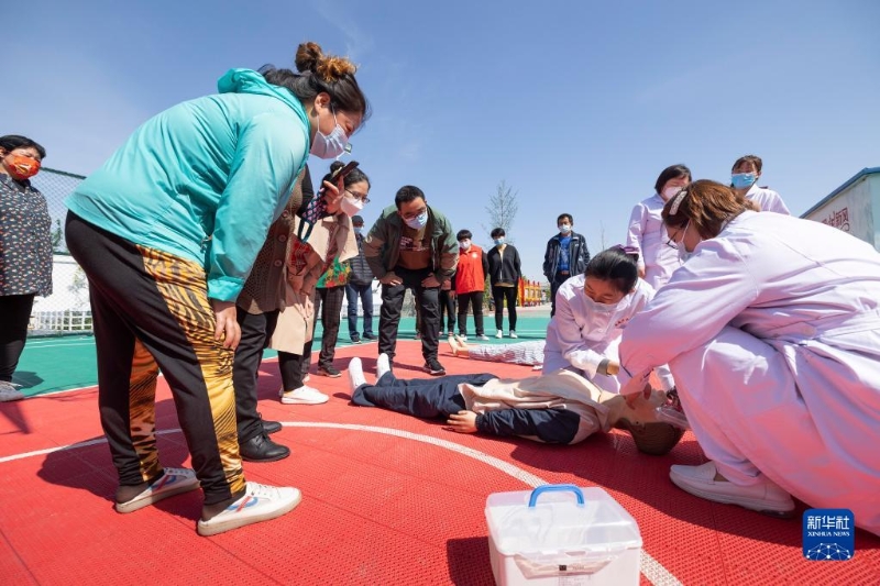 5月7日,在河北省唐山市豐南區(qū)岔河鎮(zhèn),醫(yī)務(wù)人員向村民講解心肺復(fù)蘇急救知識。