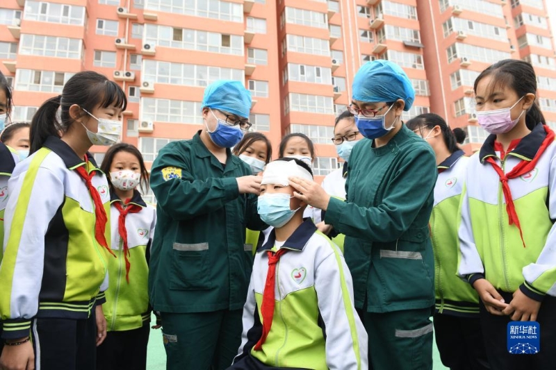 5月7日,在河北省石家莊新樂市民生街小學(xué),新樂市中醫(yī)院醫(yī)護(hù)人員向?qū)W生講解急救包扎知識。