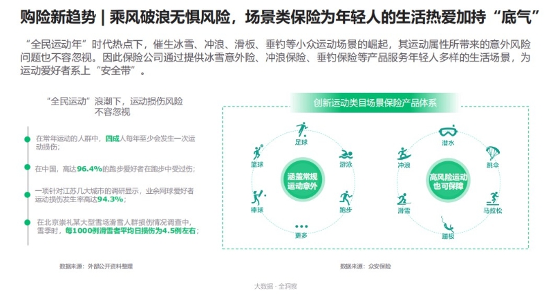 與此同時,在“全民運動年”的時代熱點及冰雪、沖浪等小眾運動場景崛起之下,互聯(lián)網(wǎng)險企試圖通過提供冰雪意外險、沖浪保險、垂釣保險等產(chǎn)品,為運動愛好者系上“安全帶”。比如,眾安保險的運動意外險創(chuàng)新運動類目場景保險產(chǎn)品體系,不僅涵蓋游泳、跑步等常規(guī)運動意外,滑雪、跳傘等高風險運動也可保障,為年輕人的生活熱愛加持“底氣”。