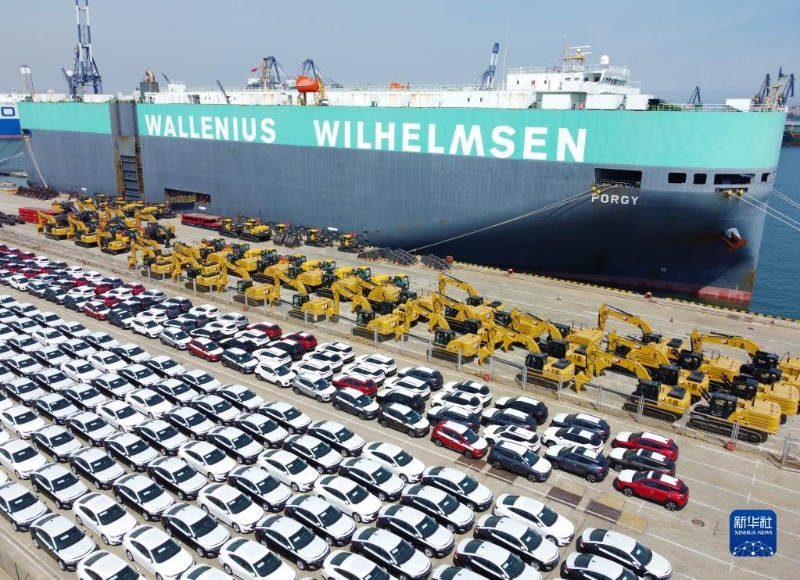 大批出口商品車在山東港口煙臺港集結等待裝船(5月9日攝,無人機照片)。新華社發(fā)(唐克攝)