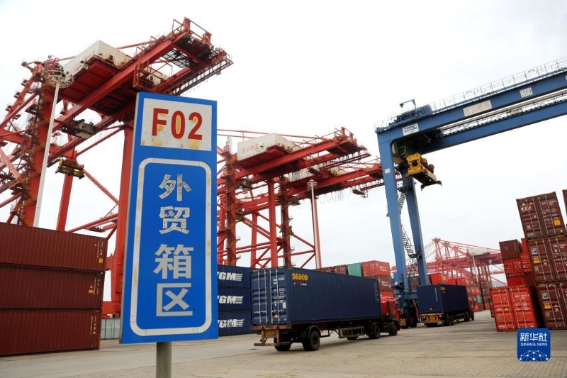 5月9日,在江蘇省連云港港集裝箱碼頭,運輸車輛向貨輪轉運集裝箱。新華社發(fā)(王春攝)
