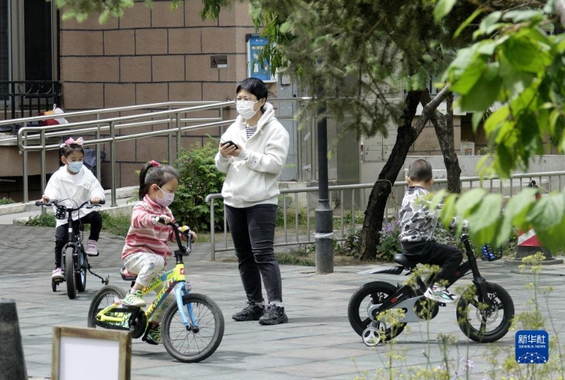 5月9日,孩子們在朝陽區(qū)一個小區(qū)內(nèi)的公共綠地玩耍。