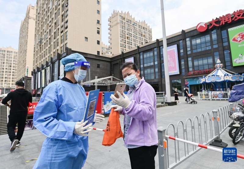 在上海市嘉定區(qū)一家超市,工作人員在商超入口處核驗(yàn)購物者的防疫碼(5月9日攝)。