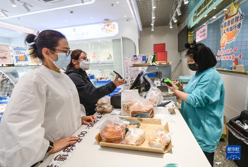 顧客在上海市松江區(qū)中山中路的一家面包店購物(5月10日攝)。