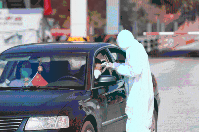 抗疫人員在高速路口為市民測量體溫