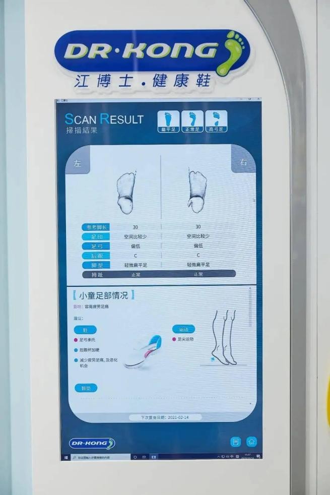 而現(xiàn)在,江博士健康鞋的每家門店都配備了專業(yè)的3D智能驗(yàn)?zāi)_儀,能為4歲及29碼以上的小朋友提供免費(fèi)的“驗(yàn)?zāi)_配墊”服務(wù)。該驗(yàn)?zāi)_儀能通過(guò)內(nèi)置的多部深度相機(jī),360°拍攝孩子雙足的立體腳型,多維度讀取足部數(shù)據(jù),全方位判別足部發(fā)育情況。通過(guò)系統(tǒng)可以了解到孩子腳型是扁平足、高弓足、還是正常足,也能知道孩子是否有拇趾外翻、足外翻等情況,最后系統(tǒng)還會(huì)根據(jù)孩子的足弓幅度及后跟斜度,從江博士A、B、C+、C四款鞋墊中,推薦最合適的一款,承托孩子不同弧度的足弓,有效舒緩足部疲勞。