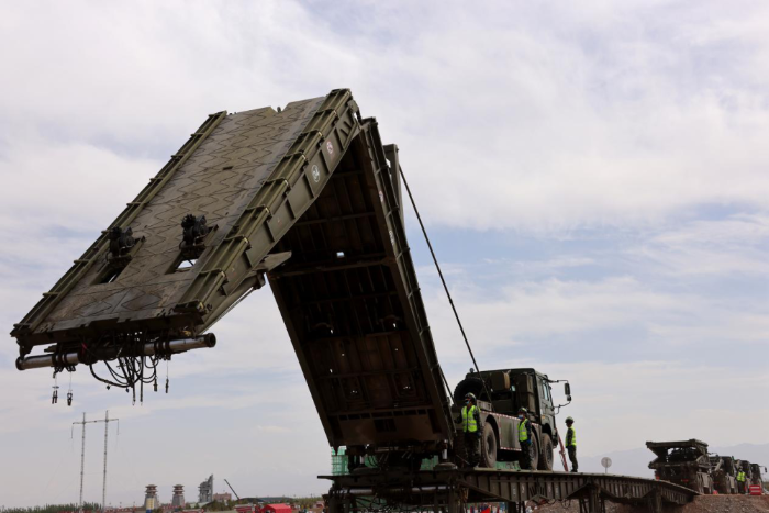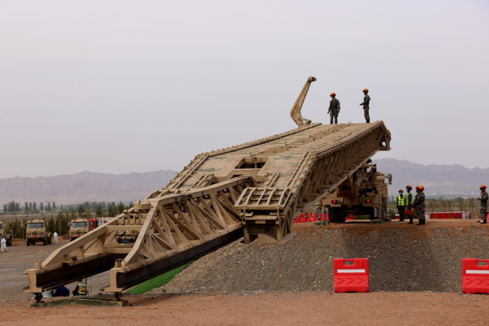 ↑陸軍第76集團(tuán)軍某工程防化旅橋梁架設(shè)組推出重型支援橋橋跨。王連彬 攝