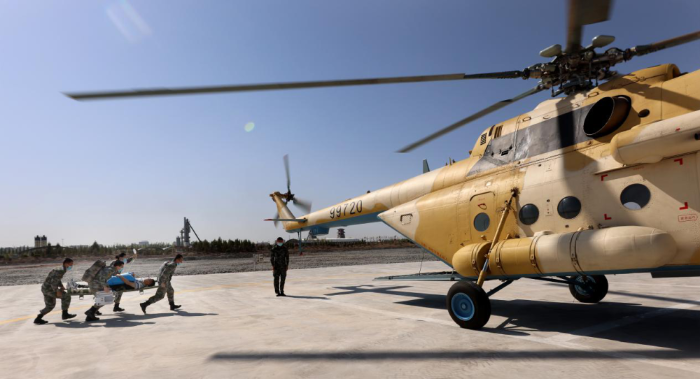 ↑野戰(zhàn)醫(yī)療分隊利用直升機快速轉(zhuǎn)運“傷員” 。王連彬 攝