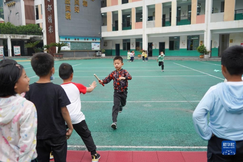 5月12日,在汶川縣映秀鎮(zhèn)映秀小學(xué),學(xué)生們在體育課上進(jìn)行接力賽。