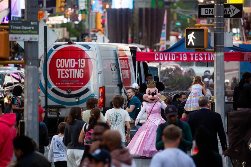 5月12日,在美國紐約時報廣場,人們從一個新冠檢測點旁經(jīng)過。新華社發(fā)(郭克攝)