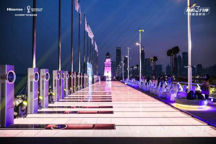 在青島的蜿蜒海岸線上,許多市民被燈光秀吸引,加入到激情歡暢的行列。青島市政府領(lǐng)導(dǎo)和各界嘉賓做客現(xiàn)場(chǎng),與全網(wǎng)直播觀眾一起開(kāi)啟足球激情。足壇名宿——金頂老茂宿茂臻與各位足球小將一起進(jìn)行足球表演,宣告著世界杯激情即將到來(lái),也為青島的濱海增添球場(chǎng)綠茵的色彩。在綠茵環(huán)繞中清新油然而生,海信新風(fēng)空調(diào)正式開(kāi)啟世界杯征程,也正式宣布城市更新計(jì)劃,為全球億萬(wàn)家庭喚醒足球賽事激情與健康生命澎湃。