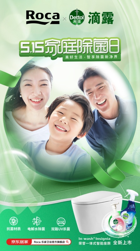 如今,全民健康衛(wèi)生意識達(dá)到前所未有的高峰,此次以除菌為亮點(diǎn)的In-Wash? Insignia榮譽(yù)一體式智能座廁上市,衛(wèi)浴專家Roca攜手專業(yè)消毒除菌品牌滴露,組成“家庭除菌新凈拍檔”,旨在攜手從生活的點(diǎn)滴細(xì)節(jié)守護(hù)全家,提升健康潔凈的生活品質(zhì)。Roca和滴露此次共創(chuàng)“家庭除菌日“,發(fā)起線上線下的家庭健康守護(hù)活動(dòng),并同步宣發(fā)聯(lián)名禮盒。 5月15日到5月31日之間,在Roca和滴露官方微博和小紅書平臺參與互動(dòng),分享“家家有本凈化論”相關(guān)內(nèi)容,便有機(jī)會(huì)贏取Roca榮譽(yù)一體式智能座廁以及“家庭除菌新凈拍檔聯(lián)名禮盒”(禮盒內(nèi)含滴露浴室清潔除菌噴霧、滴露慕斯泡沫抑菌洗手液,以及價(jià)值500元的Roca代金券和榮譽(yù)一體式智能座廁明信片一組)。以中國家庭需求為中心,Roca和滴露珠聯(lián)璧合打造無懈可擊的衛(wèi)生組合,“舒”寫智享除菌新凈界。