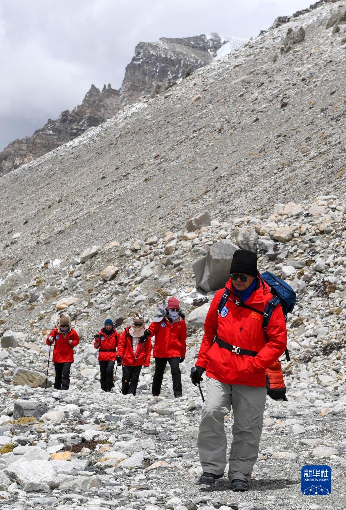 中國科學院院士、北京大學環(huán)境科學與工程學院院長朱彤(右一)和科研人員在珠峰登山大本營和絨布冰川間徒步穿梭(5月1日攝)。新華社記者 姜帆 攝