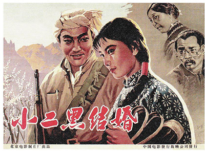 在延安文藝座談會(huì)的影響下,作家趙樹(shù)理于1943年創(chuàng)作完成短篇小說(shuō)《小二黑結(jié)婚》。1964年,由北京電影制片廠根據(jù)該小說(shuō)改編的同名電影上映,以電影的形式重溫了抗戰(zhàn)時(shí)期青年小二黑和小芹為追求婚姻自由,在黨的關(guān)懷下沖破封建家長(zhǎng)阻撓、結(jié)為夫婦的故事。電影《小二黑結(jié)婚》海報(bào)由著名軍旅畫家江平先生繪就。海報(bào)承襲了原著及影片活潑、清新的格調(diào),富有質(zhì)樸、濃郁的山西鄉(xiāng)土氣息,凸顯出解放區(qū)進(jìn)步青年的形象。