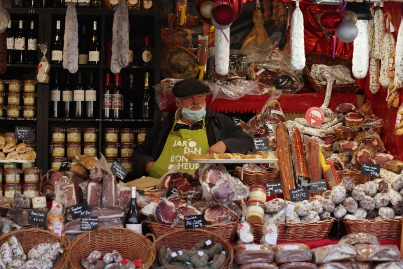 2021年12月9日,在法國巴黎的一處圣誕市場,一名攤主在攤位前等待客人光臨。新華社記者高靜攝