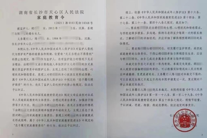 長沙市天心區(qū)人民法院發(fā)出的家庭教育令。
