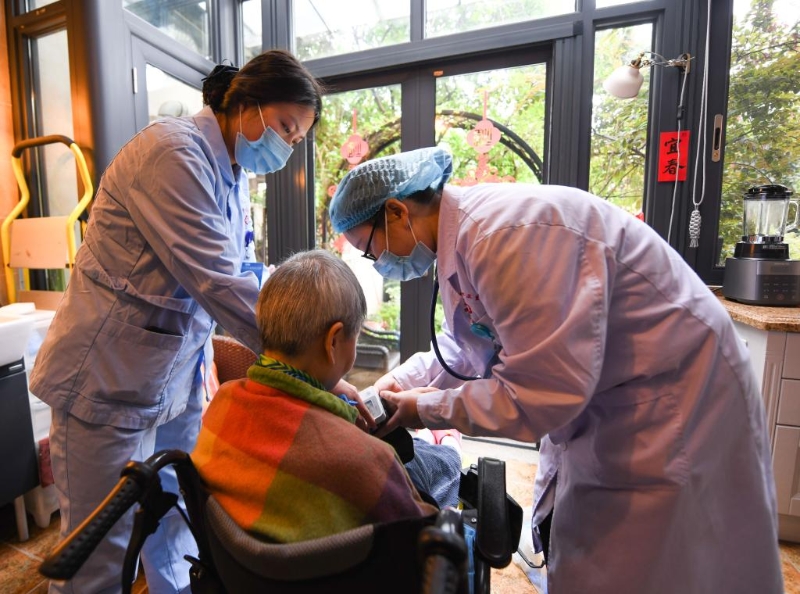 5月18日,在成都市溫江區(qū)萬(wàn)春鎮(zhèn)天鄉(xiāng)路社區(qū)居民家中,家庭醫(yī)生楊靜(右)和護(hù)士黃佳妮(左)為居民葉茂群檢查身體。新華社記者王曦 攝