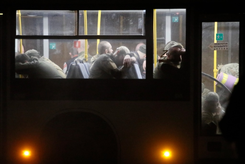 5月20日,載著烏克蘭武裝人員的巴士抵達俄軍控制的奧列尼夫卡鎮(zhèn)。新華社發(fā)(維克托攝)