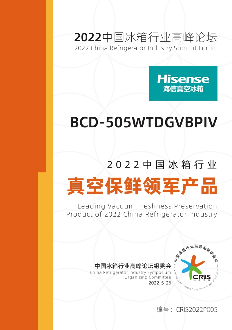 真空保鮮再獲雙重認證,助力行業(yè)穩(wěn)步深度進階。5月26日,在2022年中國冰箱行業(yè)高峰論壇上,海信真空冰箱憑借505產(chǎn)品的出色表現(xiàn),斬獲“2022中國冰箱行業(yè)真空保鮮領(lǐng)軍產(chǎn)品”獎項,矚目全場。
