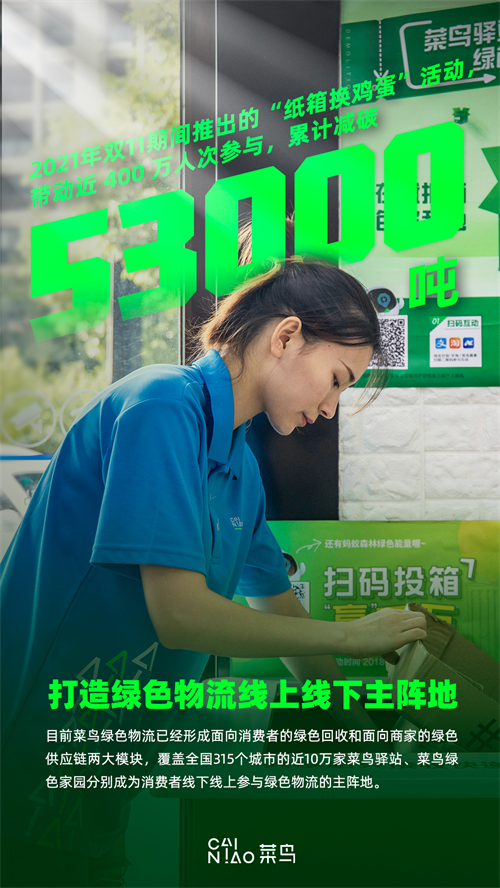 面向消費(fèi)者,菜鳥(niǎo)對(duì)“回箱計(jì)劃”進(jìn)行升級(jí),綠色回收箱覆蓋到全國(guó) 31 個(gè)省(自治區(qū)、直 轄市) 的 315 個(gè)城市近10萬(wàn)個(gè)菜鳥(niǎo)驛站,雙11期間推出的“紙箱換雞蛋”活動(dòng),帶動(dòng)近 400 萬(wàn)人次參與快遞包裝回收,累計(jì)減碳 5.3 萬(wàn)噸。