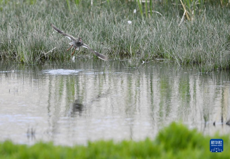 紅腳鷸在拉魯濕地飛舞(5月28日攝)。