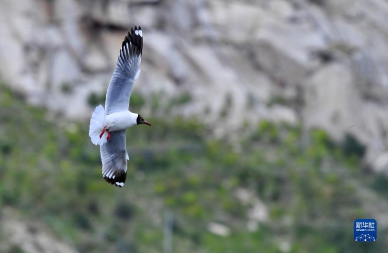 棕頭鷗在拉魯濕地上空盤旋(5月28日攝)。