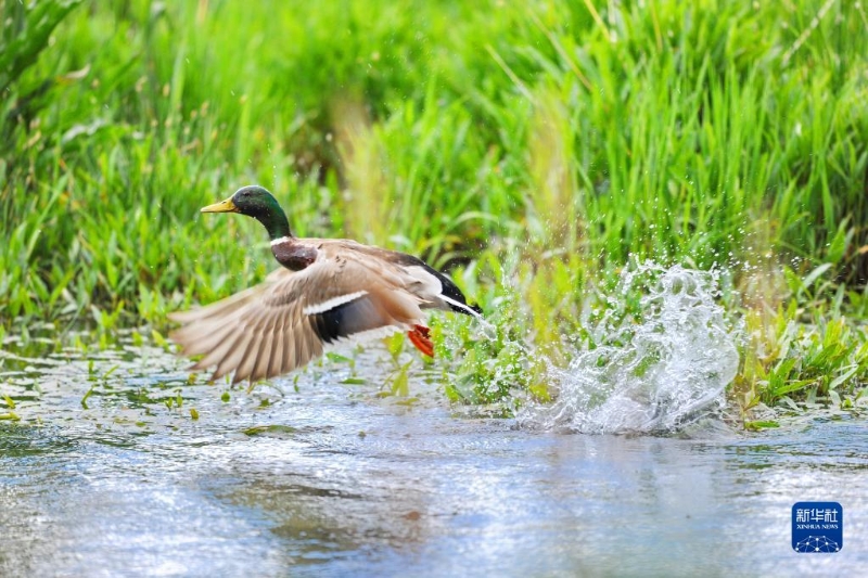 一只綠頭鴨在拉魯濕地嬉戲(5月28日攝)。