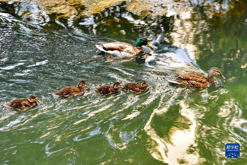 一對成年綠頭鴨帶著小鴨在拉魯濕地游動(dòng)(5月27日攝)。