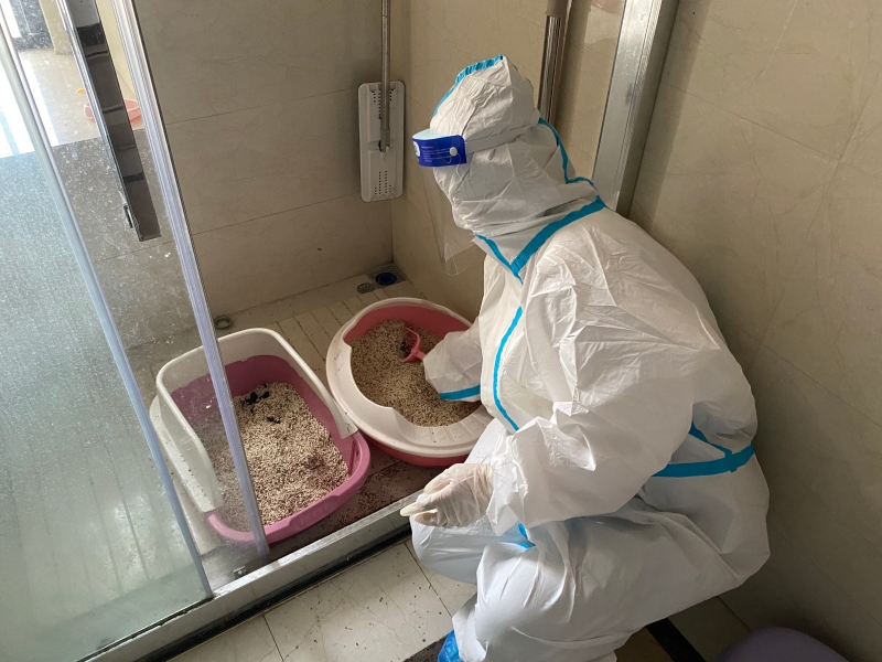 “業(yè)主需要幫助,我們怎么能不管呢?去吧!去!嚴(yán)格做好防護,上吧!”“咱們穿好防護服,戴好口罩、手套、護目鏡,互相給全身消毒,進門前先把公共區(qū)域全部消毒一遍,出來后再消毒一遍,一定要特別小心哈!”短暫的掙扎后,魏曉若和馬盼還是決定擔(dān)負(fù)起“鏟屎官”的職責(zé)。