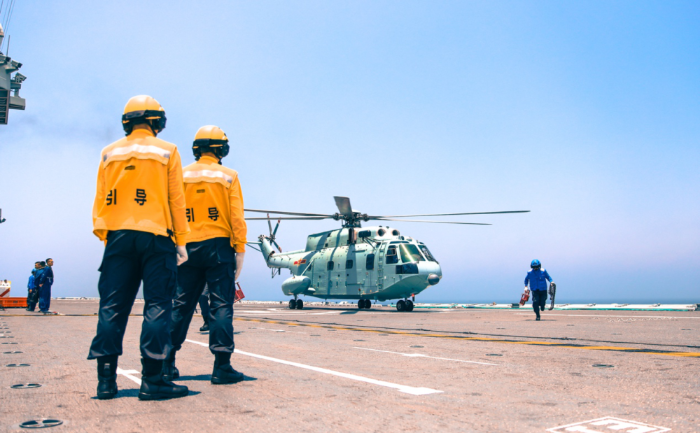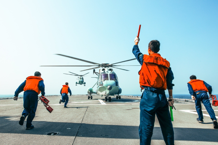 ↑艦面保障人員解除系留,直升機(jī)準(zhǔn)備開飛。林凱祥 攝