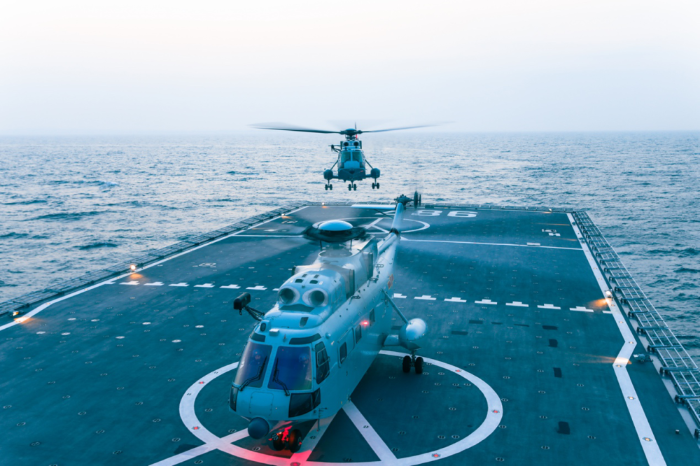 ↑直升機(jī)接力起飛,前往陌生海域開展訓(xùn)練。林凱祥 攝