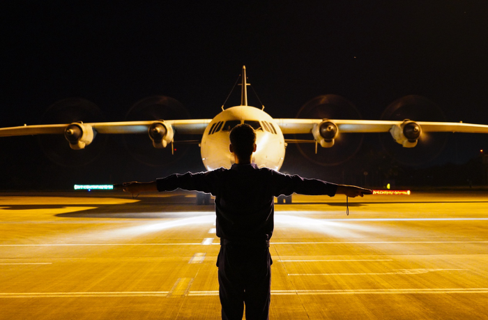 ↑返航后,機(jī)務(wù)官兵進(jìn)行夜間保障。