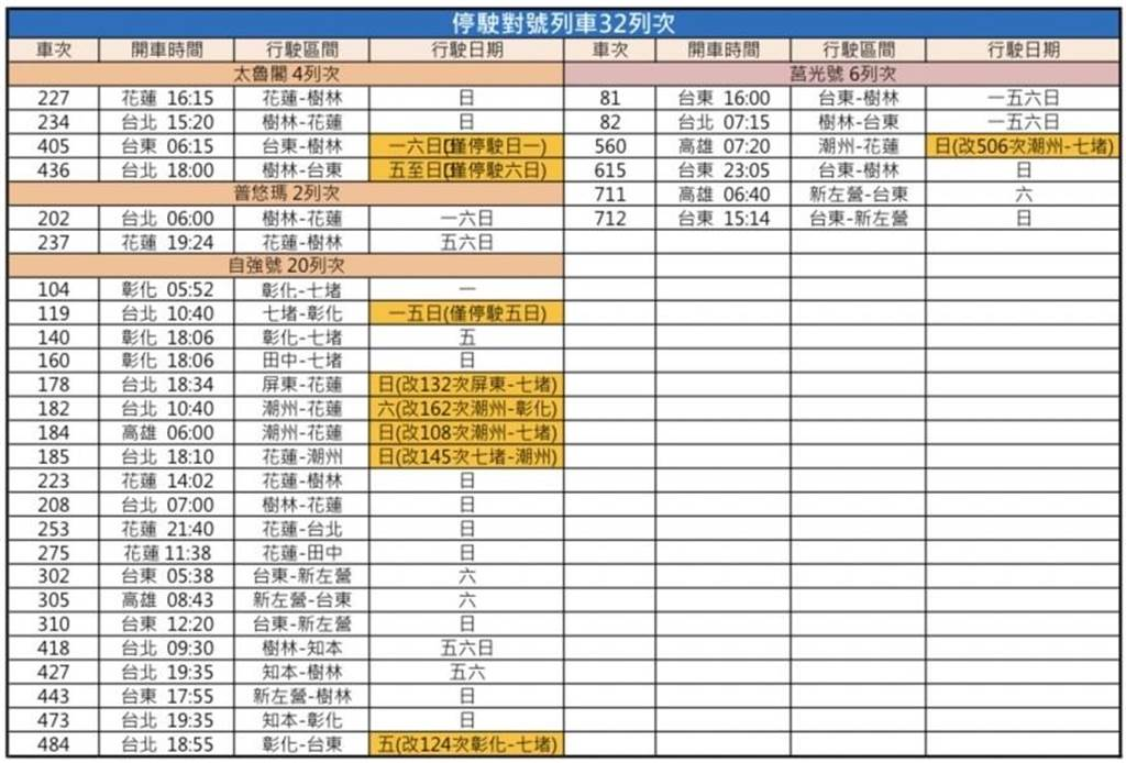 臺鐵指出,新增停駛的對號列車方面,包括東部干線太魯閣號4列次、普悠瑪號2列次,以及東、西部干線、南回線自強號20列次、莒光號6列次。