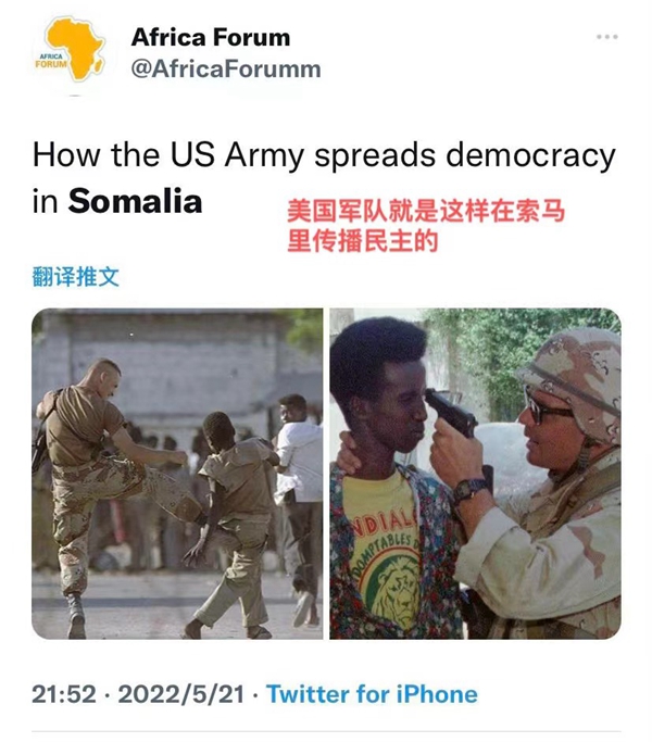 網(wǎng)友“Africa Forum”發(fā)帖反諷道,“美國軍隊(duì)就是這樣在索馬里推廣民主的”。畫面中,一位美國大兵正用槍抵著當(dāng)?shù)厝说哪X袋,另一位美國大兵正一腳踹向當(dāng)?shù)匦∧泻?,并以此為樂?/p>