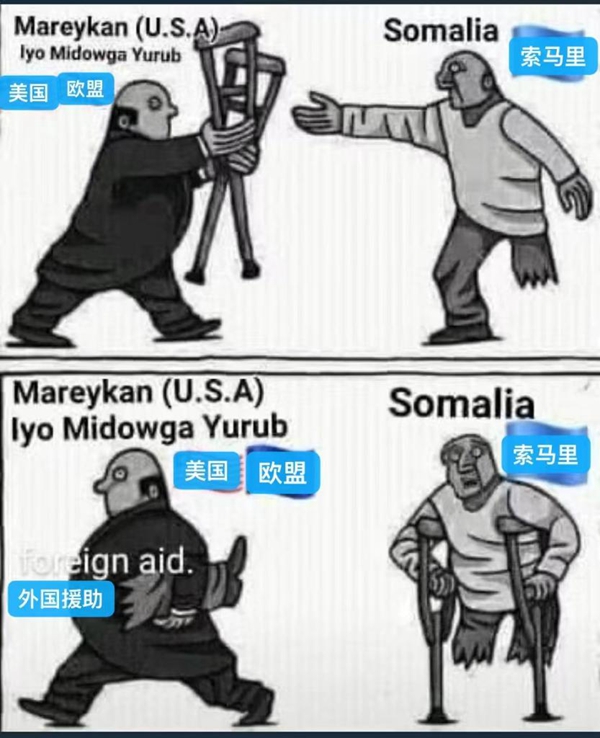 更有非洲網(wǎng)友為美國重新派兵索馬里一事,創(chuàng)作了諷刺漫畫,畫中代表美西方國家的禿頂富商,向斷了一條腿的“索馬里”送來了拐杖,而代價(jià)卻是打斷了“索馬里”的另一條腿,這樣他就只能永遠(yuǎn)依靠美西方的援助了。