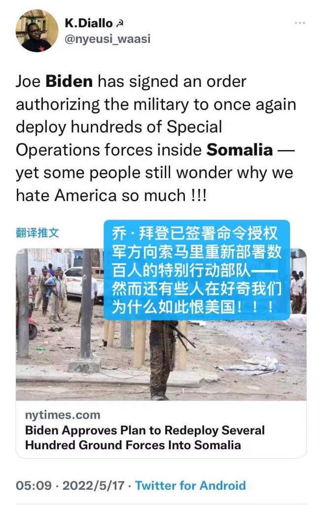 網(wǎng)友“K.Diallo”說:“喬·拜登已簽署命令,授權(quán)軍方重新在索馬里部署數(shù)百名‘特別行動(dòng)部隊(duì)’——然而還有些人好奇為什么我們?nèi)绱撕廾绹?!!”
