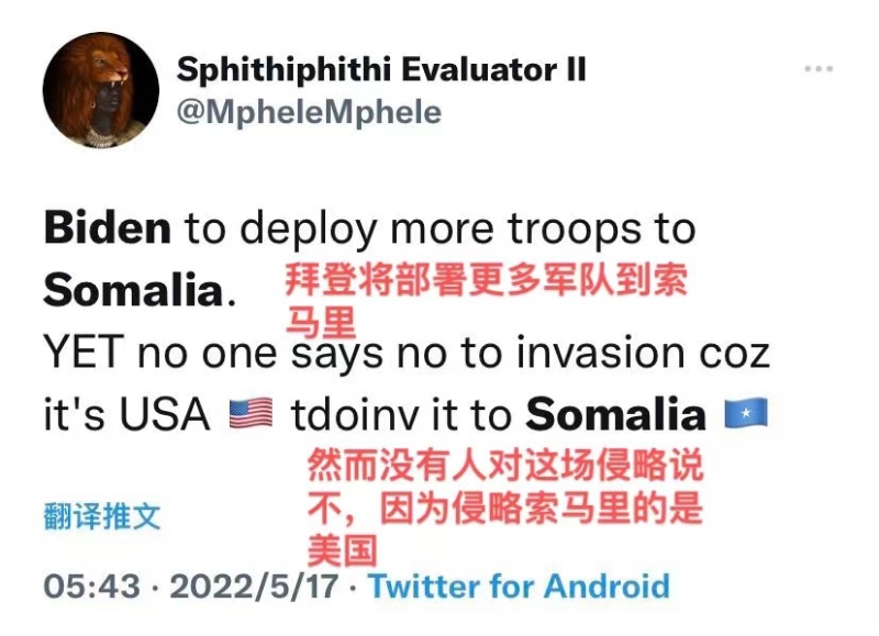 當(dāng)美國說它要給索馬里帶來“和平”和“安定”,非洲網(wǎng)友的耿直評(píng)論,道出了真相: