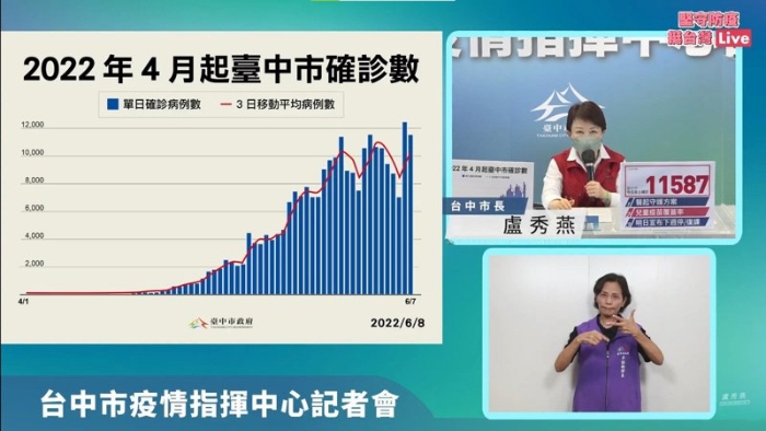 盧秀燕說明,臺中今新增1萬1587例,推估有幾個原因,第一、從疫情趨勢上來判斷,北部疫情開始下滑,中南部正在疫情高原期,評估可能有1至2周的高原期;第二、觀察線性圖,每個下降的低點都是假期,因此假日效應(yīng)很明顯,篩檢人數(shù)比較少,但周二、周三數(shù)字就開始攀升,由于端午連假期間篩檢人數(shù)少,今日是第三個開工日,確診的線性圖反應(yīng)出來,臺中疫情正處于高原期,希望民眾要做好防疫,戴好口罩。