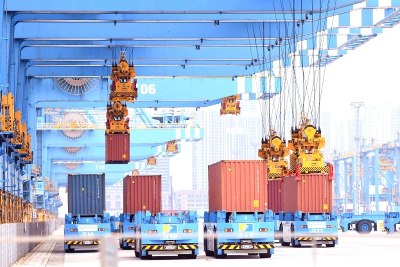 2022年6月9日,在山東港口青島港全自動(dòng)化碼頭,貨輪在裝載外貿(mào)集裝箱。新華社發(fā)(俞方平 攝)