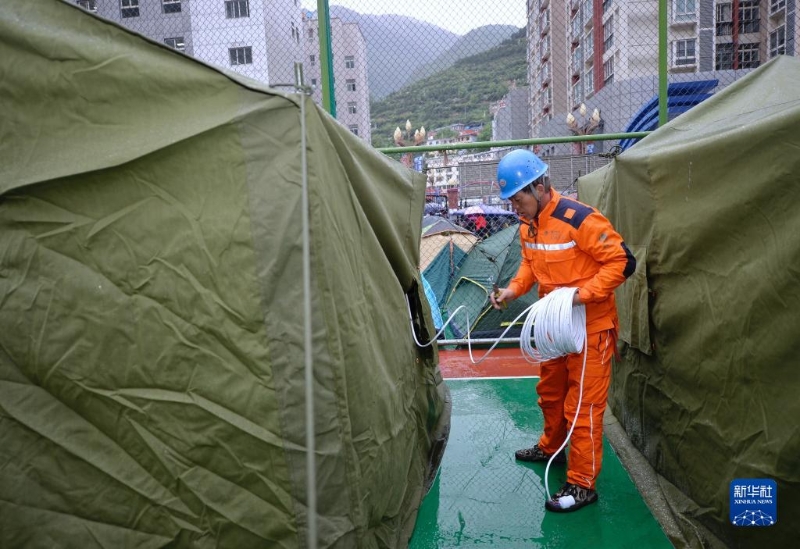6月10日,在馬爾康市州醫(yī)院背后廣場(chǎng)安置點(diǎn)內(nèi),國家電網(wǎng)工作人員在鋪設(shè)電線。新華社記者 劉坤 攝