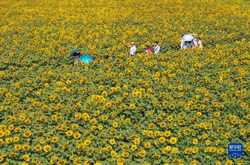 6月14日,游客在安徽省淮北市相山區(qū)渠溝鎮(zhèn)張樓村油葵種植基地賞花游玩(無人機照片)。