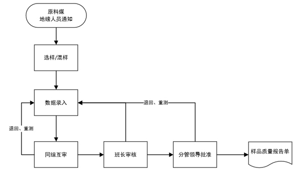 針對目前煤質數(shù)據(jù)分析面臨的問題,需要對煤質檢驗信息進行統(tǒng)一收集、傳遞、管控并出具質量報告單,并通過多渠道匯總到化驗中心。進而實現(xiàn)煤質數(shù)據(jù)統(tǒng)一管控、多渠道匯總,煤質檢測數(shù)據(jù)信息化勢在必行。煤化工生產(chǎn)企業(yè)檢測流程如下: