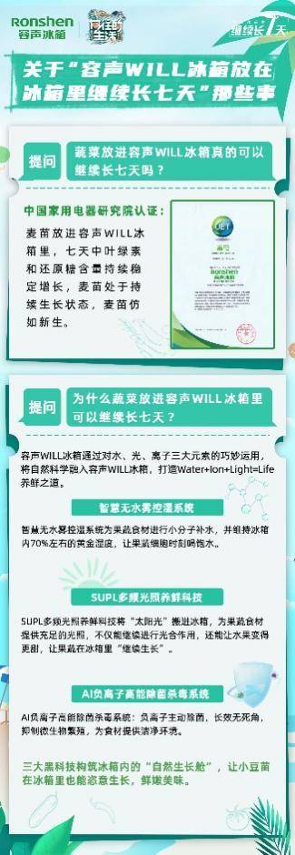 在容聲WILL559冰箱里豆子生長(zhǎng)成豆苗,這得益于容聲一直在“養(yǎng)鮮”技術(shù)上的深耕,創(chuàng)新打造WILL養(yǎng)鮮公式,還原了豆苗的自然生長(zhǎng)空間,將冰箱變成豆苗的“生長(zhǎng)艙”,才實(shí)現(xiàn)了豆子放在冰箱里,生長(zhǎng)成脆嫩鮮綠的豆苗。未來,容聲也將不斷奮進(jìn)、持續(xù)創(chuàng)新,在養(yǎng)鮮的道路上越走越寬。