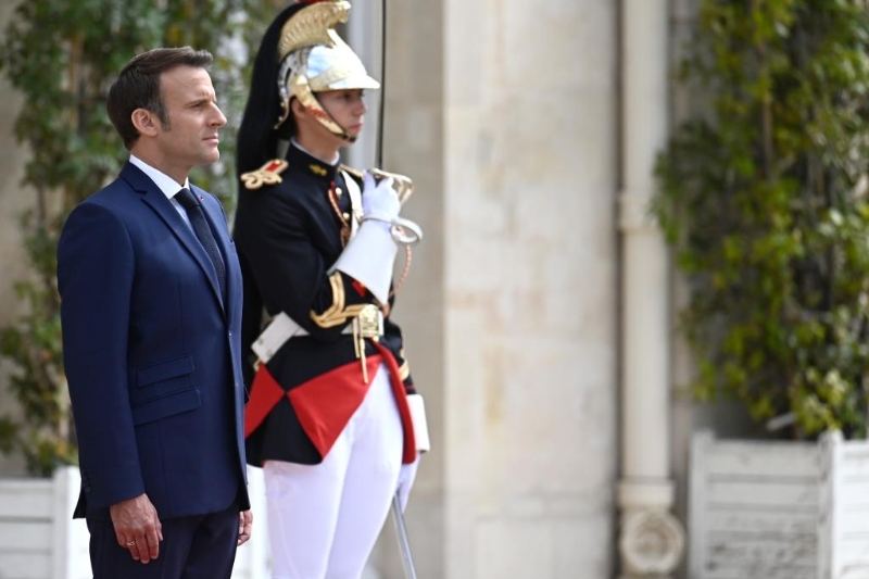 5月7日,在法國巴黎愛麗舍宮,法國總統(tǒng)馬克龍檢閱儀仗隊(duì)。(新華社發(fā))